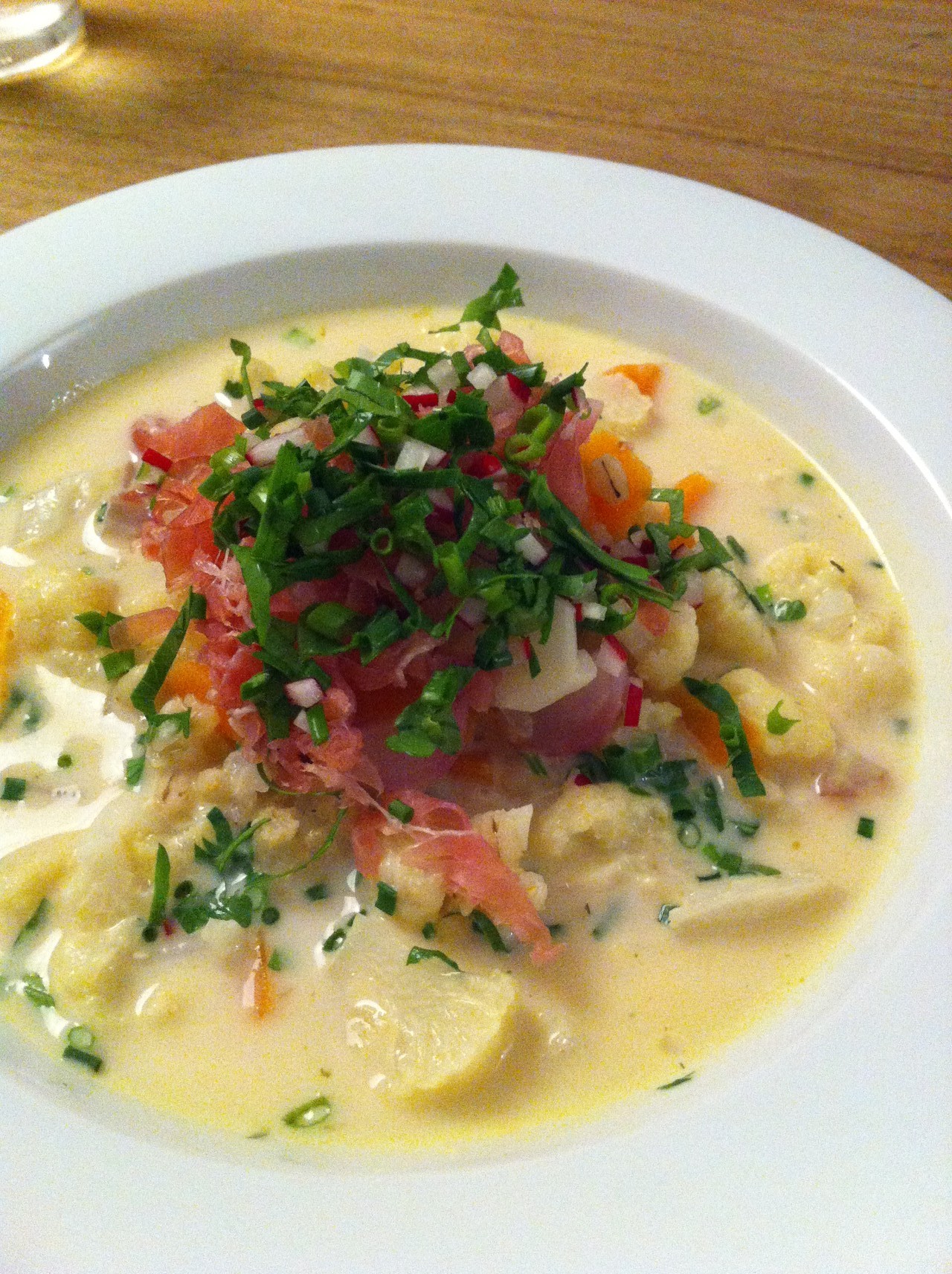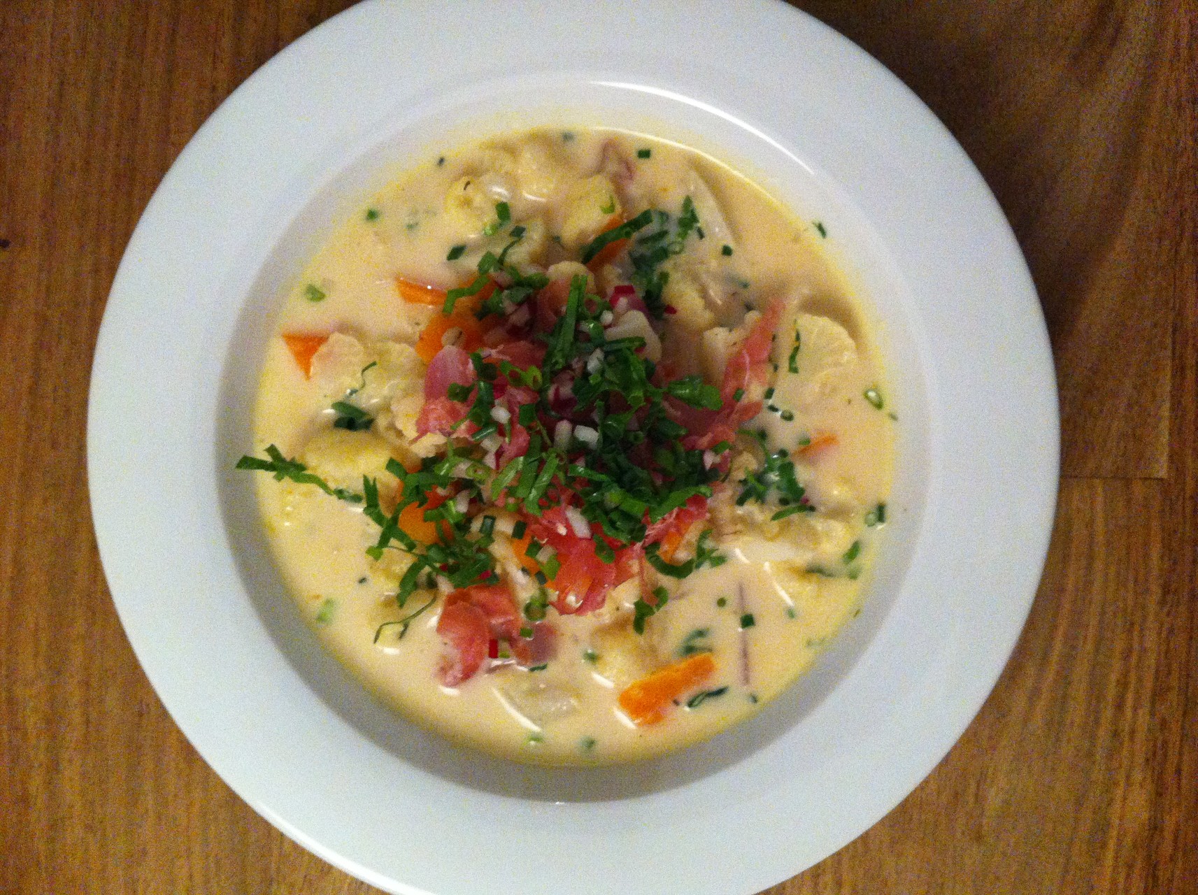 Rüebli und Blumenkohl kleinschneiden, 9 Radiesli vierteln. Rohschinken in feine Streifen schneiden.
