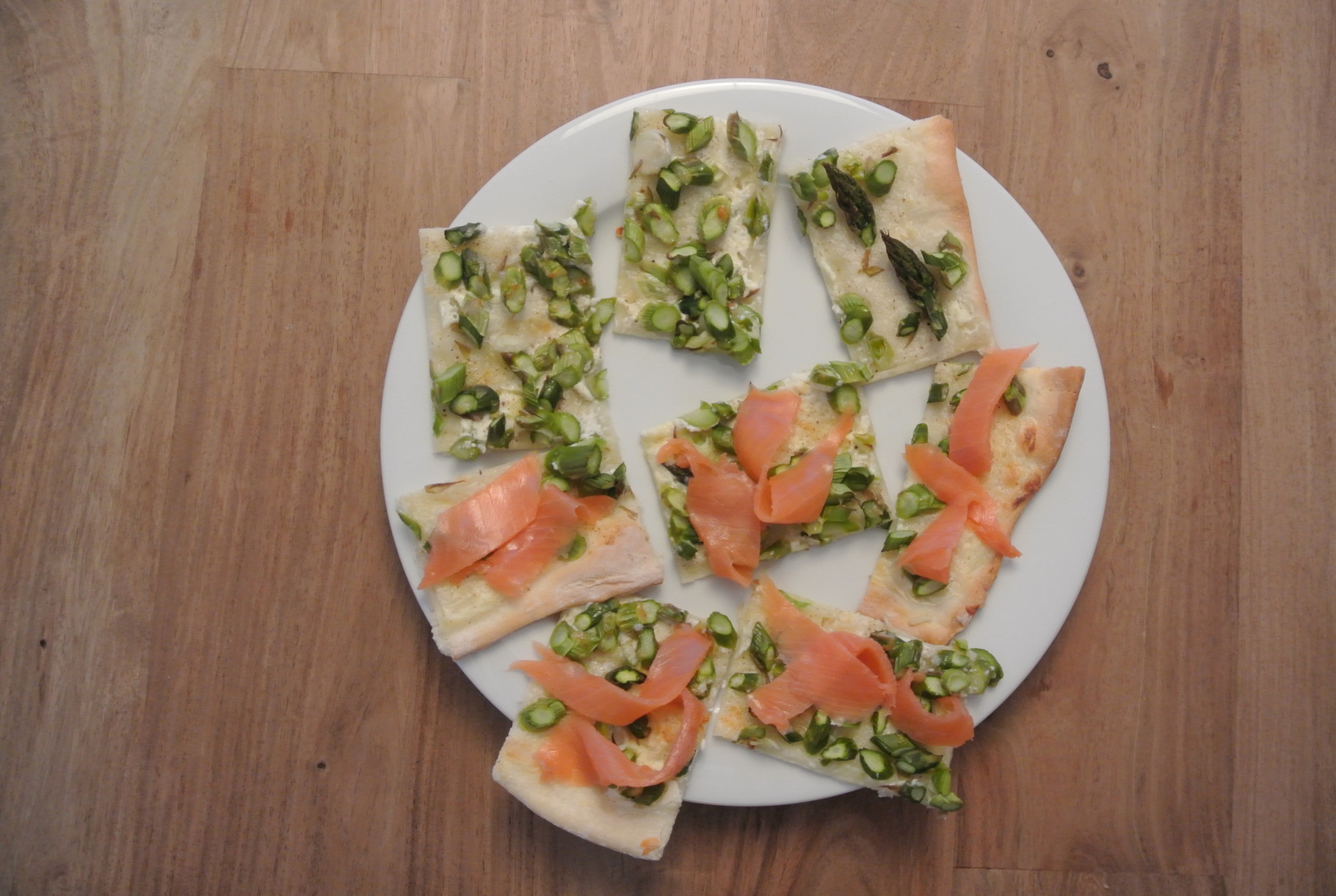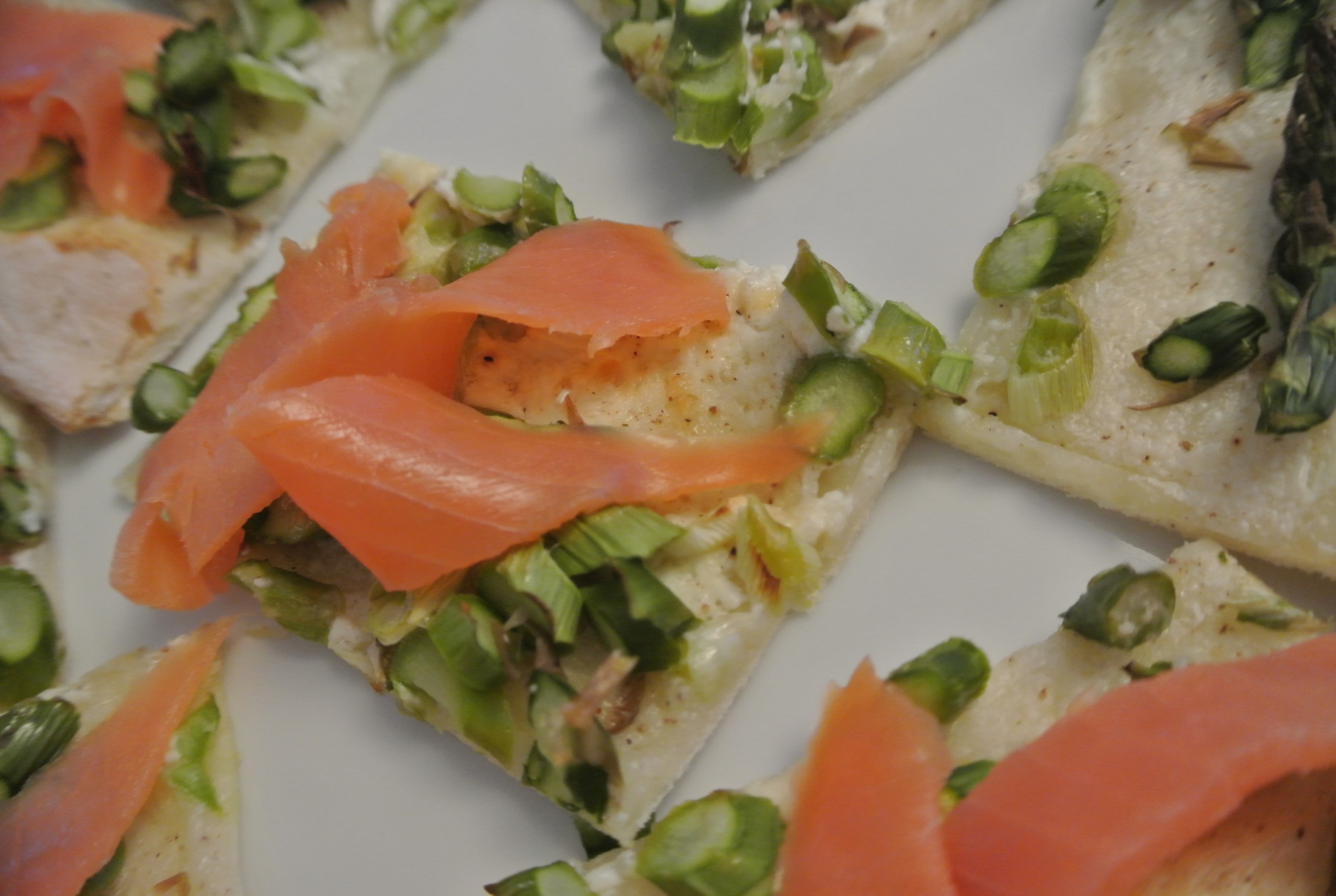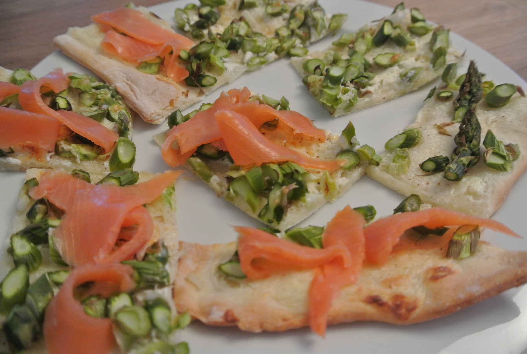 Den Lachs inzwischen in Streifen schneiden und auf dem fertigen Flammkuchen verteilen. In Stücke schneiden - fertig!
