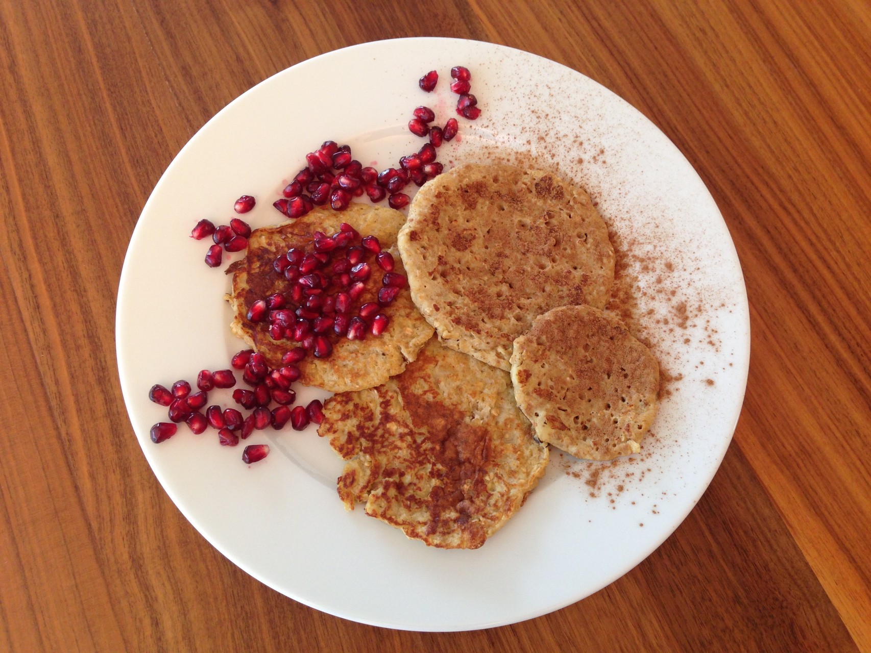 Rezept für 1 Person Zutaten: 1 kleine Banane 2 Eier 20g Haferflocken 1 EL Rapsöl zum anbraten. Beliebig garnieren. Hier im Rezept: 20g Granatapfel und Zimt. Sehr gut eignen sich aktuell natürlich auch frische Erdbeeren. Zubereitung: Banane mit einer Gabel zerdrücken. Eier in eine Schüssel geben und kurz aufschlagen. Haferflocken und Banane dazugeben und alle Zutaten gut mischen. Etwas Rapsöl in die Bratpfanne geben und die Pancakes portionenweise in der Pfanne ausbraten. Auf einem grossen...