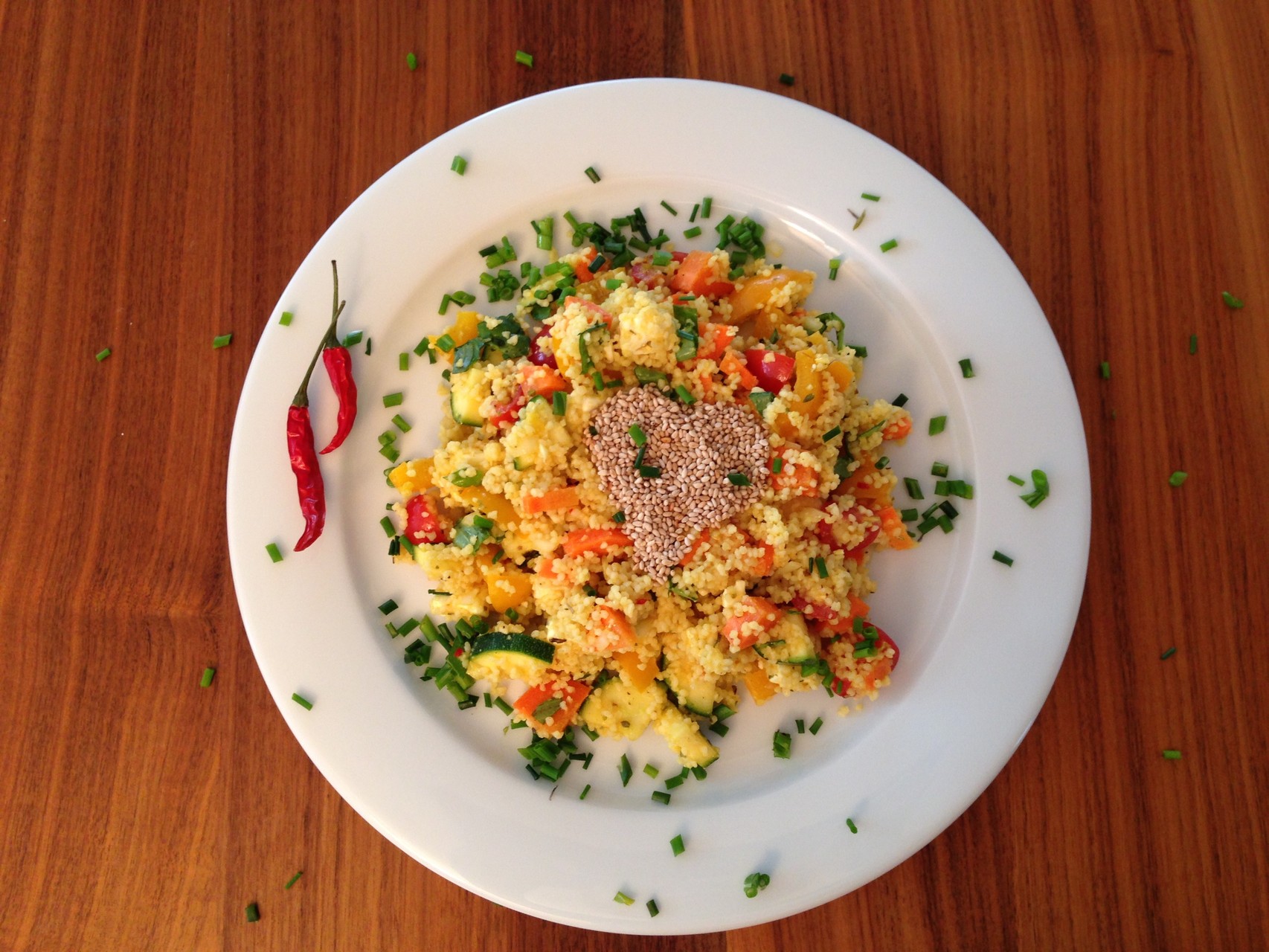 Couscous, Cous Cous oder Kuskus ist ein Gericht der nordafrikanischen Küche. Er wird aus befeuchtetem und zu Kügelchen zerriebenem Griess aus Weizen (Hartweizengrieß), Gerste oder Hirse hergestellt. Couscous wird zum Garen nicht gekocht, sondern über kochendem Wasser oder einem kochenden Gericht gedämpft. Quelle: Wikipedia.de Beim heutigen Rezept haben wir uns für einen leckeren Couscous-Salat entschieden. Farbenfroh, erfrischend, lecker! Auch im Sommer ein tolles Gericht.