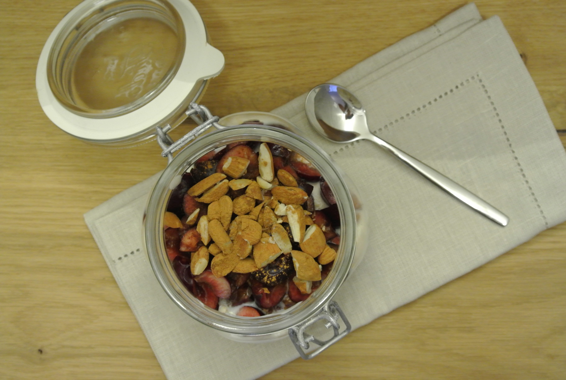 "Overnight oats" sind nichts anderes als über Nacht eingeweichte Haferflocken. So werden die Flocken schön weich und cremig. Da das Frühstück bereits am Abend vorher vorbereitet wird, gilt nun auch die Ausrede "ich habe keine Lust am Morgen in die Küche zu stehen..." nicht mehr! :-) REZEPT: Für 1 Portion 50g Haferflocken 1dl Milch 2-3 EL Naturjoghurt 10g Mandeln, gehackt 100 Kirschen entsteint und geviertelt (oder andere Früchte - je nach Saison) wenig Zimt Haferflocken, Milch und Zimt...