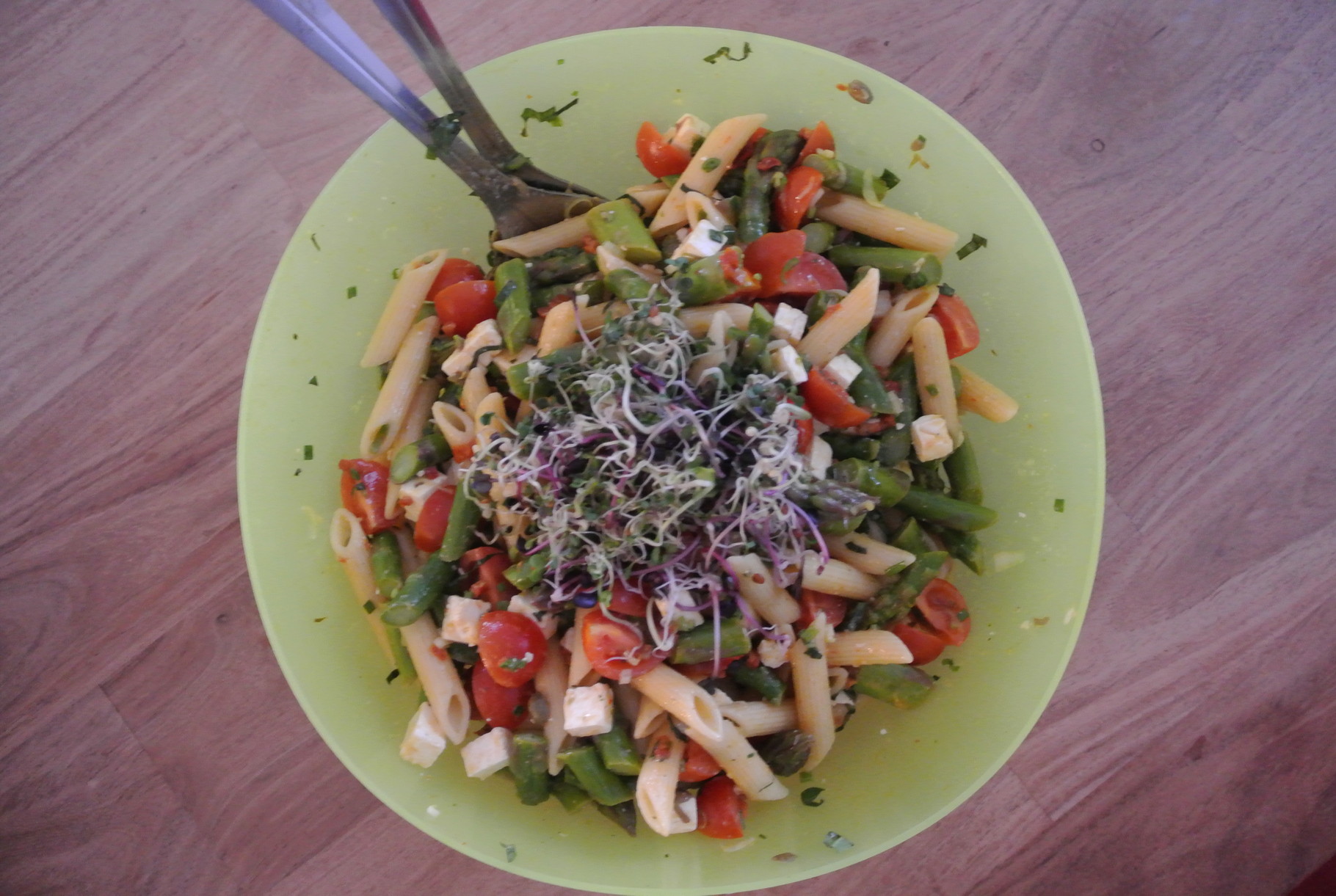 Rezept Für 2 Personen: 500g grüne Spargeln (wenn möglich frisch vom Bauernhof ;-)) 120g Teigwaren 100g Feta 1 Frühlingszwiebel Für die Sauce: 2 EL Olivenöl 2 EL Essig Salz, Pfeffer Schnittlauch, Peterli, Basilikum, feingeschnitten Nach belieben: 1 TL Kapern und 1 TL getrocknete Tomaten gehackt Spargeln waschen, der eingetrocknete Teil unten abschneiden. Für die Teigwaren Salzwasser aufkochen. Teigwaren hinzugeben. Ca. 5-6 Minuten vor Ende der Kochzeit die Spargeln ganz dazugeben und mit...